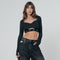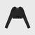 Black long-sleeved top made of lycra with a small cut out on the chest and a branded elastic base. It has long sleeves with thumbholes.