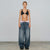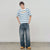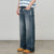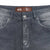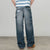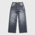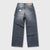 Gray, men's carpenter-style pants with a wide leg. They feature embroidered designs on the back pockets and the logo on one side, a carpenter pocket on the other side, and a decorative strap on the other side. They have aged-effect seams and mid rise.
