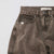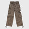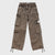 Dark brown washed denim cargo pants. Features two cargo-style pockets on the right leg and one on the left. Adjustable straps at the ankles for a better fit. Easy to combine with our t-shirts and tops. Mid-rise and straight leg.