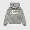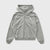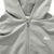 Gray cotton zip-up hoodie. It features kangaroo pockets on the front, ribbed cuffs and waistband. It features a flat print on the front and a raised print on the back.