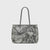 Gray tote bag with all-over print and logo applique on the front. It has an inner pocket and zipper. The straps and base are made of a synthetic material.