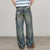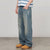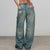 This jeans are washed, they have drawstrings at the waist and back and side embroidery.