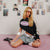 Black t-shirt with cream-colored shoulders and lower sides, long sleeves, and an oversized silhouette. It features a high-density logo print on the front.