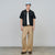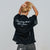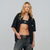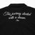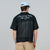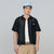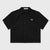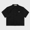 Black short-sleeve shirt with a textured effect and boxy silhouette. It features a side front pocket, an embroidered logo on the front, and an embroidered phrase from the collection on the back.