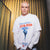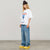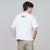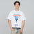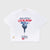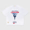 White t-shirt with a boxy silhouette. It has a collection design printed on the front and the logo printed on the back.