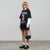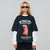 Black boxy t-shirt with the logo printed on the back and a collection design printed on the front.