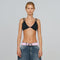 It is a play on the triangle top with two layers of different fabrics. It has a metallic piece on the chest with the logo and double straps.